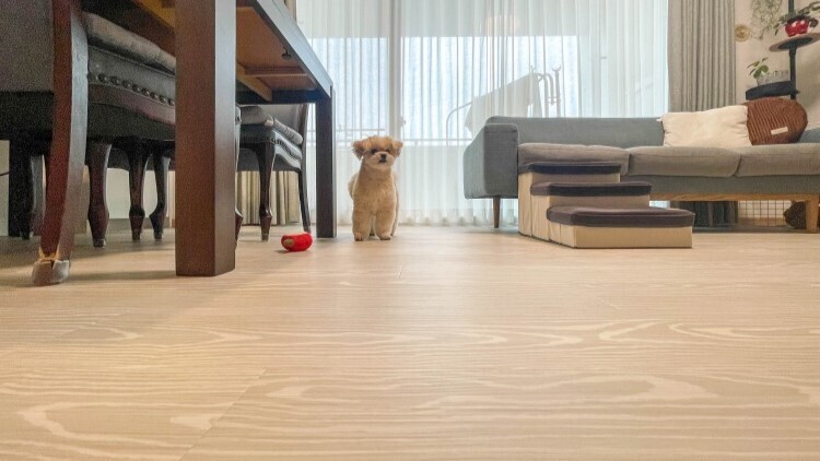 おうちの中でも元気に遊ぶワンちゃんにとっては、お住まいの床を滑りにくい素材にすることで足腰の負担もかなり軽減されます。ファーマーズオリジンのお客様からのご相談で一番多いのが、「わんちゃんの滑らない床」です。ポメラニアンとコトン・ド・テュレールのミックス犬の「琴ちゃん」も、ファーマーズオリジンにご家族でお食事にご来店いただいた際に、すべらない床をご相談いただきました。愛らしくて快活で社交的なコトン・ド・テュレールの犬種らしく、琴ちゃんも元気いっぱい! 後ろ脚に負担のかからない床をお探しでした。ショールームでママとお姉ちゃんと一緒に、滑り止めになる隆起のある床を体験してくださいました。色も柄もたくさんあり、素材は木のフローリングから、デザインのすてきなフロアタイルなど、意外と選択肢が多いのも特徴です。