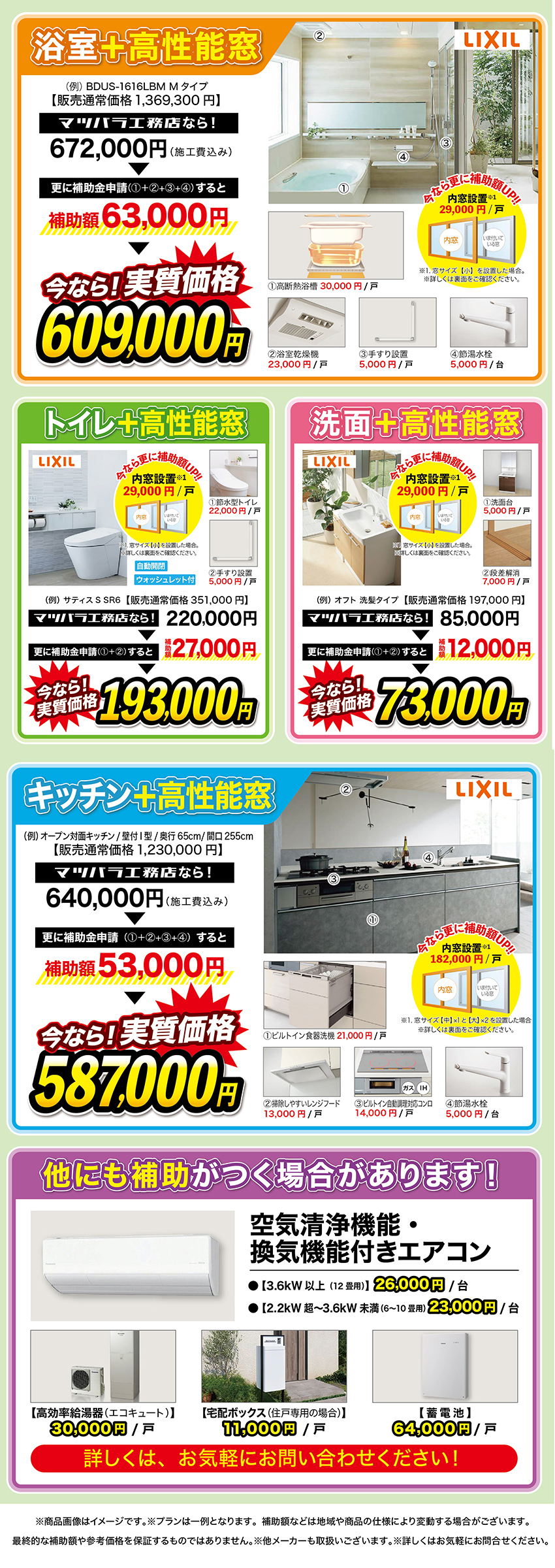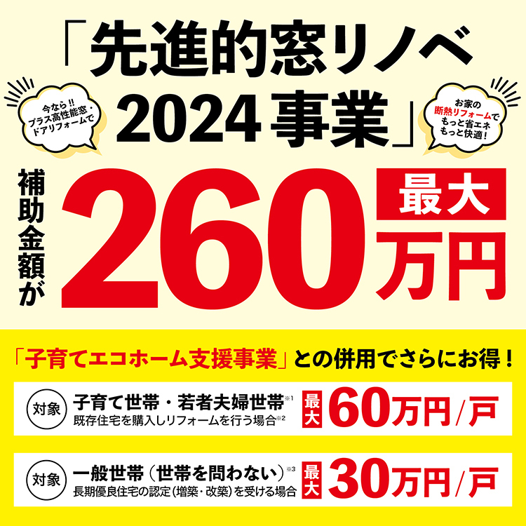 昨今、国のリフォーム補助金制度が注目をあつめています。省エネ基準の高いリフォームに補助額が多く割り当てられ、この制度を使いお家の性能をアップ! オトクに快適なお住まいに刷新されるご家族が増えています。昨年も予算はすぐに到達しましたが、2024年も新たに制度が決定いたしました。年々、利用されるご家族が多いので、お早目にお申込みいただくことをオススメいたします。